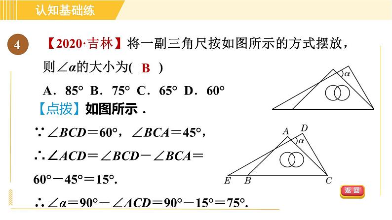 【2020·吉林】将一副三角尺按如图所示的方式摆放,则∠α的大小为( )A.85° B.75° C.65° D.60°