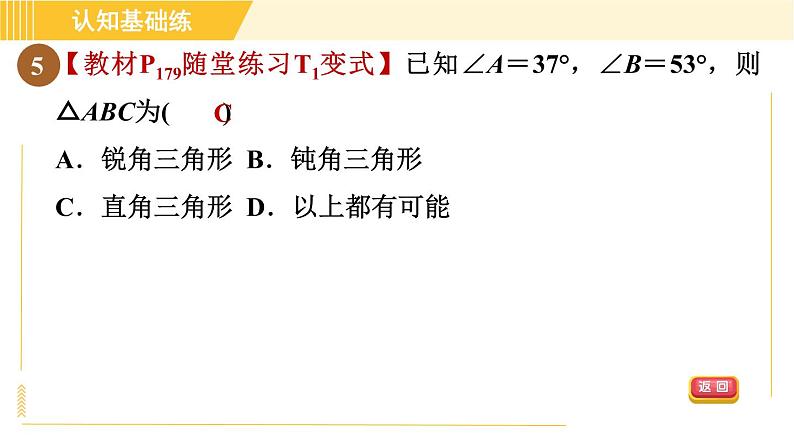 【教材P179随堂练习T1变式】已知∠A=37°,∠B=53°,则△ABC为( )A.锐角三角形 B.钝角三角形C.直角三角形 D.以上都有可能