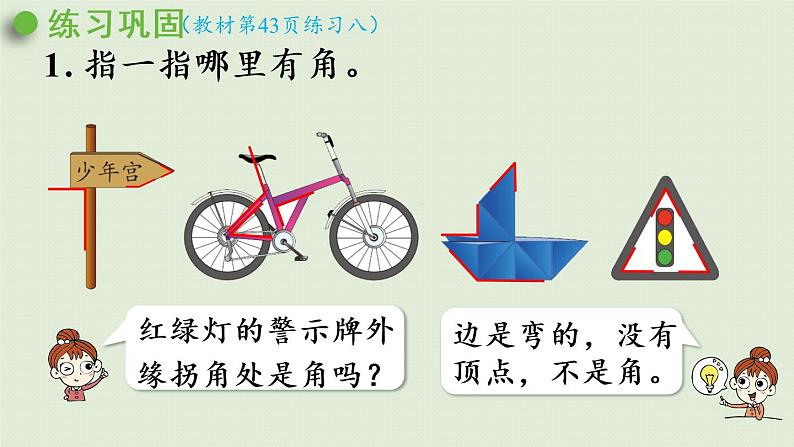 13.(1)说一说七巧板中的每块板是什么形状,上面各有哪些角。