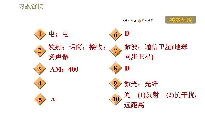 这是一份粤沪版九年级下册2 广播电视与通信集体备课ppt课件,共30页。PPT课件主要包含了AM400,习题链接,答案呈现,激光光纤,夯实基础逐点练,扬声器,摄像机,显示器,通信卫星,地球同步卫星等内容,欢迎下载使用。