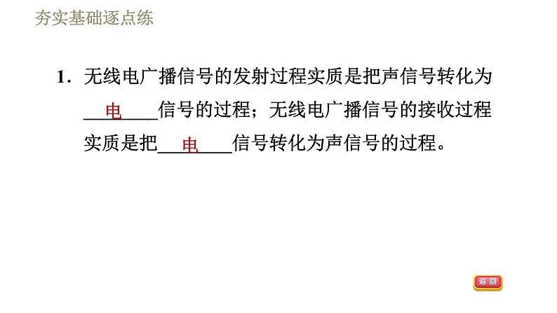 1.无线电广播信号的发射过程实质是把声信号转化为________信号的过程;无线电广播信号的接收过程实质是把________信号转化为声信号的过程。