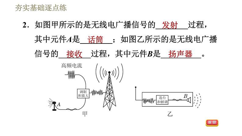 2.如图甲所示的是无线电广播信号的________过程,其中元件A是________;如图乙所示的是无线电广播信号的________过程,其中元件B是__________。