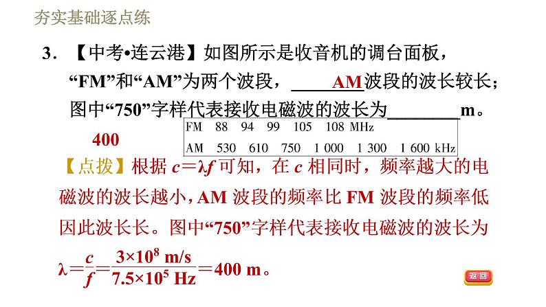 3.【中考•连云港】如图所示是收音机的调台面板,“FM”和“AM”为两个波段,________波段的波长较长;图中“750”字样代表接收电磁波的波长为________m。