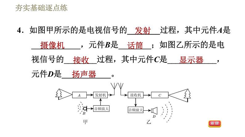 4.如图甲所示的是电视信号的________过程,其中元件A是____________,元件B是________;如图乙所示的是电视信号的________过程,其中元件C是____________,元件D是____________。