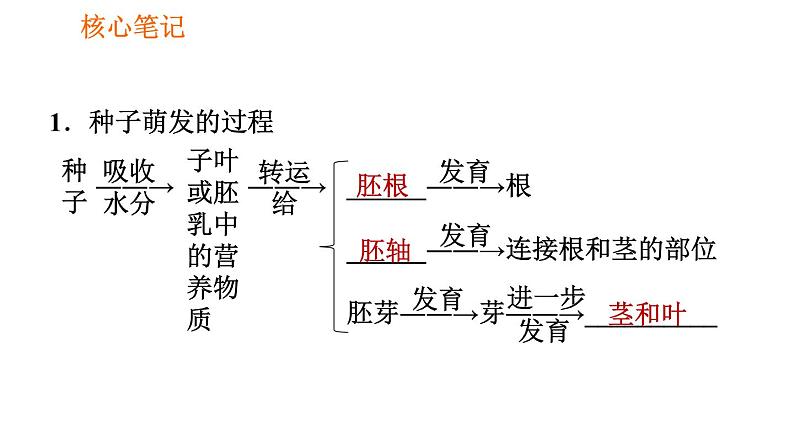【点拨】种子萌发首先是吸水膨胀,同时子叶或胚乳中的营养物质转运给胚根、胚芽、胚轴。随后胚根发育,突破种皮,形成根;胚轴伸长;胚芽发育成茎和叶。