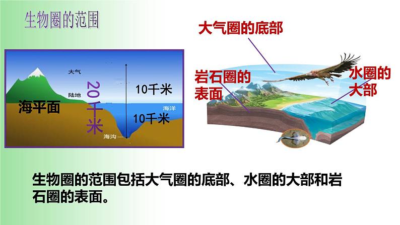 生物圈的范围包括大气圈的底部、水圈的大部和岩石圈的表面。