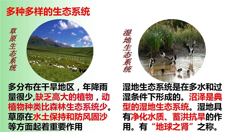 二 、多种多样的生态系统 森林生态系统、草原生态系统、湿地生态系统、海洋生态系统、农田生态系统、城市生态系统、淡水生态系统。