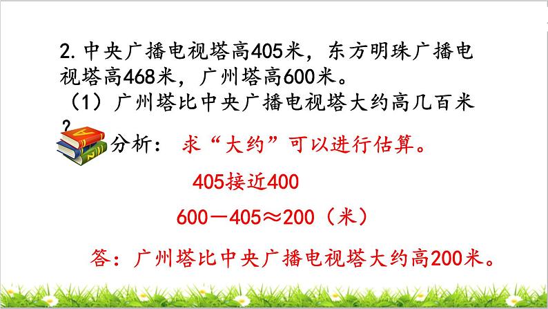 2.中央广播电视塔高405米,东方明珠广播电视塔高468米,广州塔高600米。(1)广州塔比中央广播电视塔大约高几百米?