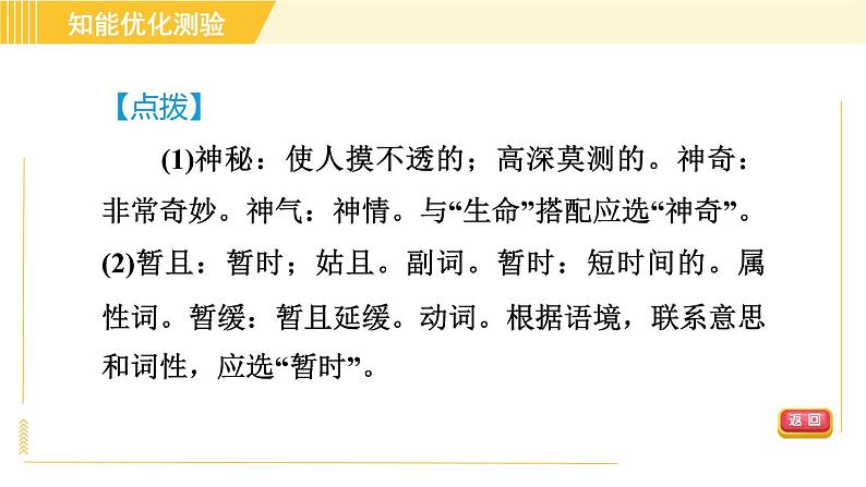 【点拨】(1)神秘:使人摸不透的;高深莫测的。神奇:非常奇妙。神气:神情。与“生命”搭配应选“神奇”。(2)暂且:暂时;姑且。副词。暂时:短时间的。属性词。暂缓:暂且延缓。动词。根据语境,联系意思和词性,应选“暂时”。