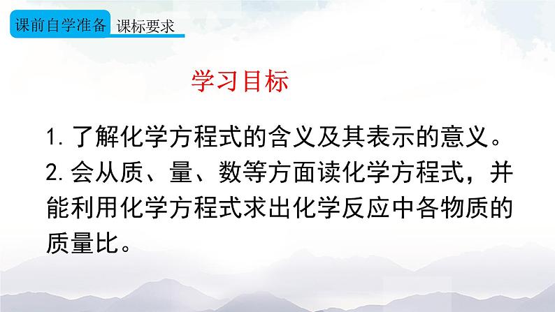 展开1.了解化学方程式的含义及其表示的意义。2.会从质、量、数等方面读化学方程式,并能利用化学方程式求出化学反应中各物质的质量比。