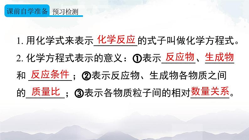 1. 用化学式来表示_________的式子叫做化学方程式。2. 化学方程式表示的意义:①表示_______、______和 _________;②表示反应物、生成物各物质之间的________;③表示各物质粒子间的相对________。