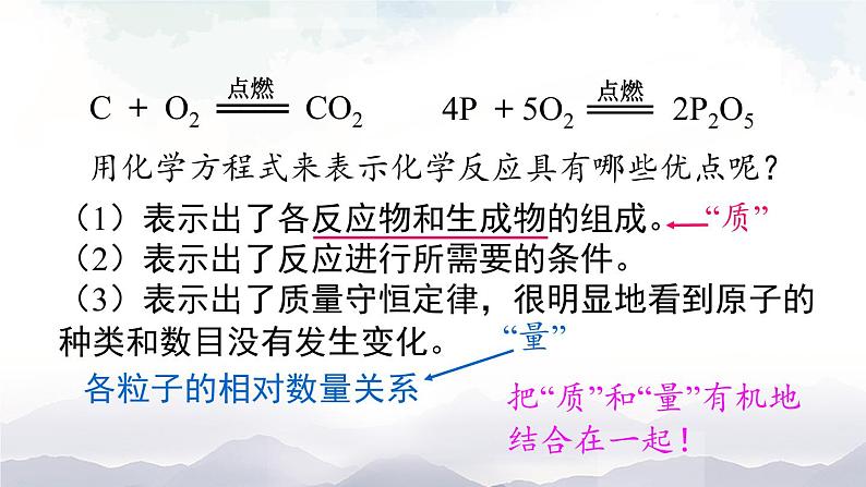 (1)表示出了各反应物和生成物的组成。(2)表示出了反应进行所需要的条件。(3)表示出了质量守恒定律,很明显地看到原子的种类和数目没有发生变化。