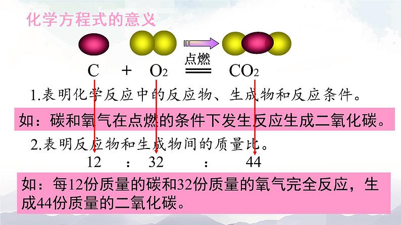化学方程式的意义:(1)表示出了反应物、生成物和反应条件。(2)表示出了反应物与生成物间的质量比。(3)化学反应中各物质之间的微粒个数比。