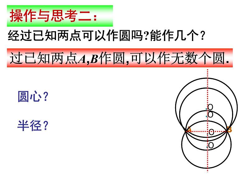 4、如图,已知直线l和直线l外 两点A、B,且A、B在l的两旁, 则经过A、B两点且圆心在l上的 圆有( ) A.0个 B.1个 C.无数个 D.0个或1个或无数个