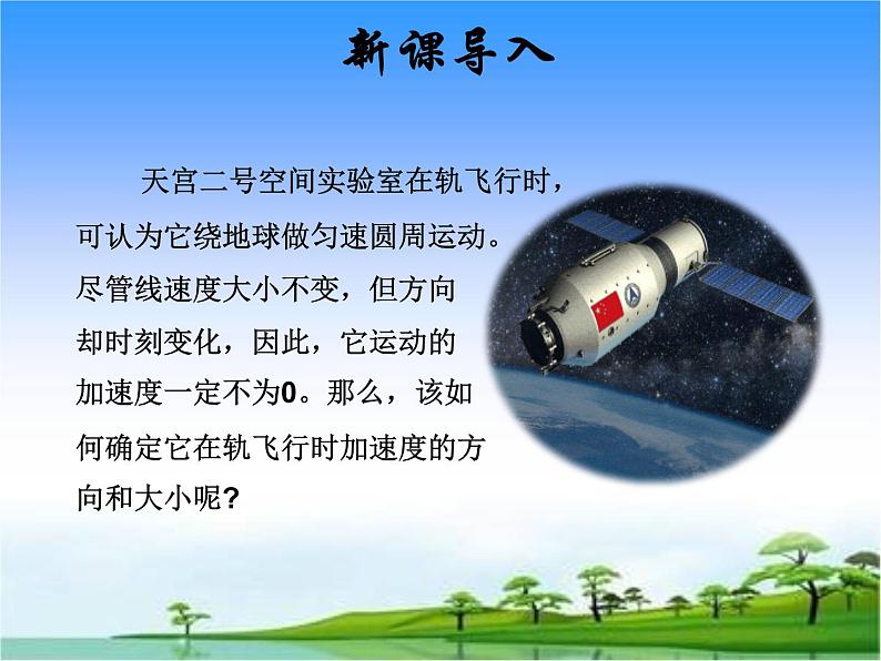 天宫二号空间实验室在轨飞行时,可认为它绕地球做匀速圆周运动。尽管线速度大小不变,但方向却时刻变化,因此,它运动的加速度一定不为0。那么,该如何确定它在轨飞行时加速度的方向和大小呢?