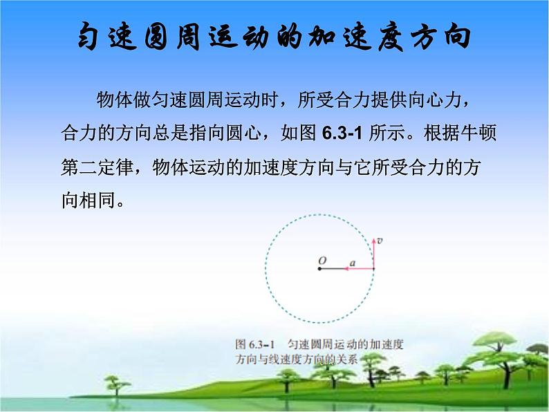 物体做匀速圆周运动时,所受合力提供向心力,合力的方向总是指向圆心,如图 6.3-1 所示。根据牛顿第二定律,物体运动的加速度方向与它所受合力的方向相同。