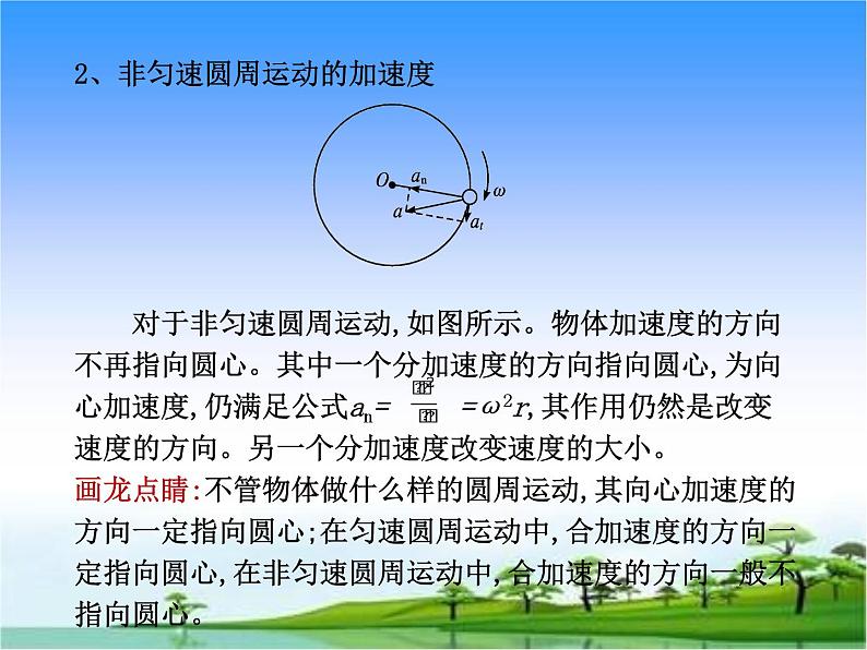 2、非匀速圆周运动的加速度 对于非匀速圆周运动,如图所示。物体加速度的方向不再指向圆心。其中一个分加速度的方向指向圆心,为向心加速度,仍满足公式an= =ω2r,其作用仍然是改变速度的方向。另一个分加速度改变速度的大小。画龙点睛:不管物体做什么样的圆周运动,其向心加速度的方向一定指向圆心;在匀速圆周运动中,合加速度的方向一定指向圆心,在非匀速圆周运动中,合加速度的方向一般不指向圆心。