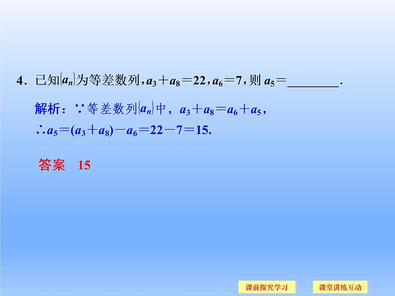 A.a1+a101>0 B.a2+a101<0C.a3+a99=0 D.a51=51解析 a1+a101=a2+a100=…=a50+a52=2a51=0.答案 C解析 a11=a7+(11-7)×3=9+12=21.答案 21