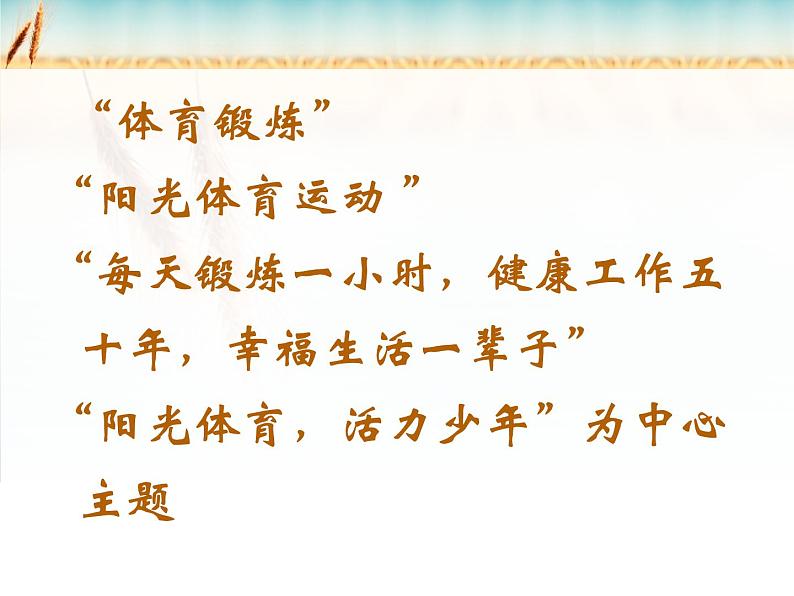 “体育锻炼”“阳光体育运动 ”“每天锻炼一小时,健康工作五十年,幸福生活一辈子” “阳光体育,活力少年”为中心主题