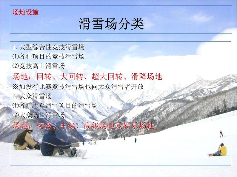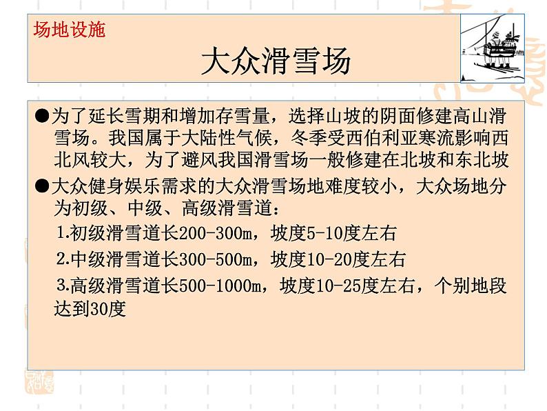 ●为了延长雪期和增加存雪量,选择山坡的阴面修建高山滑雪场。我国属于大陆性气候,冬季受西伯利亚寒流影响西北风较大,为了避风我国滑雪场一般修建在北坡和东北坡●大众健身娱乐需求的大众滑雪场地难度较小,大众场地分为初级、中级、高级滑雪道: ⒈初级滑雪道长200-300m,坡度5-10度左右 ⒉中级滑雪道长300-500m,坡度10-20度左右 ⒊高级滑雪道长500-1000m,坡度10-25度左右,个别地段达到30度