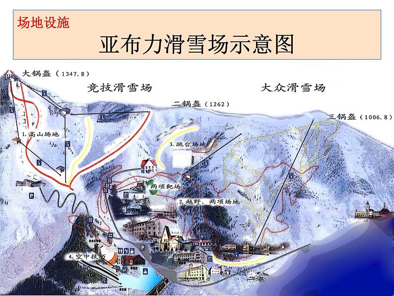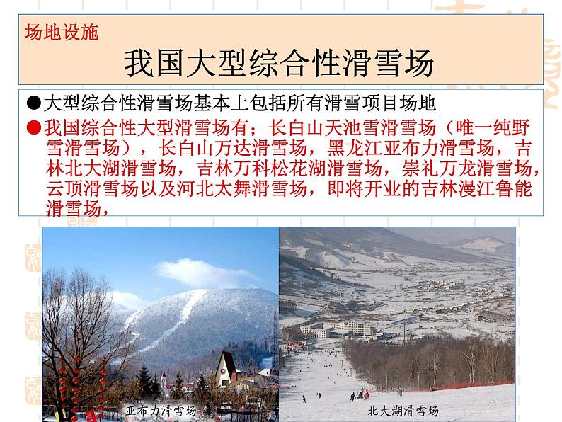 ●大型综合性滑雪场基本上包括所有滑雪项目场地●我国综合性大型滑雪场有;长白山天池雪滑雪场(唯一纯野雪滑雪场),长白山万达滑雪场,黑龙江亚布力滑雪场,吉林北大湖滑雪场,吉林万科松花湖滑雪场,崇礼万龙滑雪场,云顶滑雪场以及河北太舞滑雪场,即将开业的吉林漫江鲁能滑雪场,