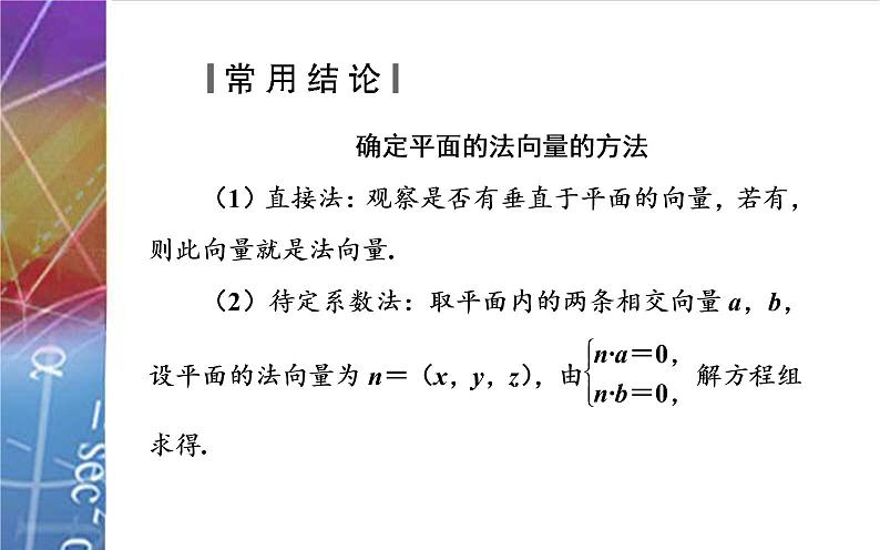 这是一份备战2024高考一轮复习数学(理) 第八章 立体几何 第五节 空间向量及其运算和空间位置关系课件PPT,共51页。PPT课件主要包含了平行或重合,x+y+z=1,a·b=0,平行或共线,n1=kn2,n1·n2=0,n·m=0,n=km,答案C,答案B等内容,欢迎下载使用。