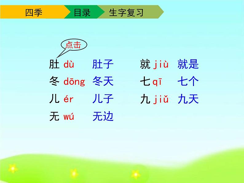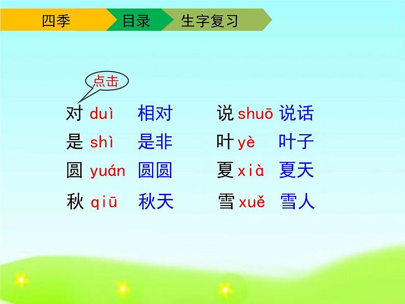 展开学习目标1、背诵课文。2、了解课文内容,知道一年有四季及每个季节的特征。3、感受各个季节的美丽,产生对大自然的喜爱之情。
