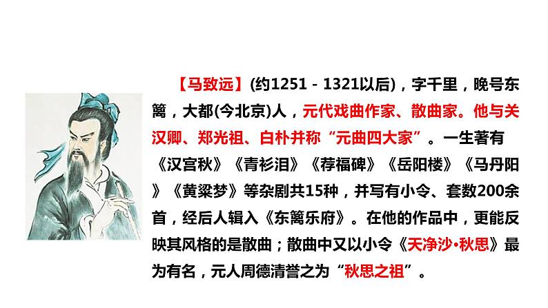 【马致远】(约1251-1321以后),字千里,晚号东篱,大都(今北京)人,元代戏曲作家、散曲家。他与关汉卿、郑光祖、白朴并称“元曲四大家”。一生著有《汉宫秋》《青衫泪》《荐福碑》《岳阳楼》《马丹阳》《黄粱梦》等杂剧共15种,并写有小令、套数200余首,经后人辑入《东篱乐府》。在他的作品中,更能反映其风格的是散曲;散曲中又以小令《天净沙·秋思》最为有名,元人周德清誉之为“秋思之祖”。