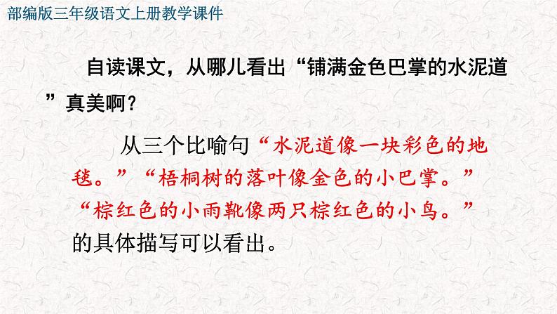 自读课文,从哪儿看出“铺满金色巴掌的水泥道”真美啊?