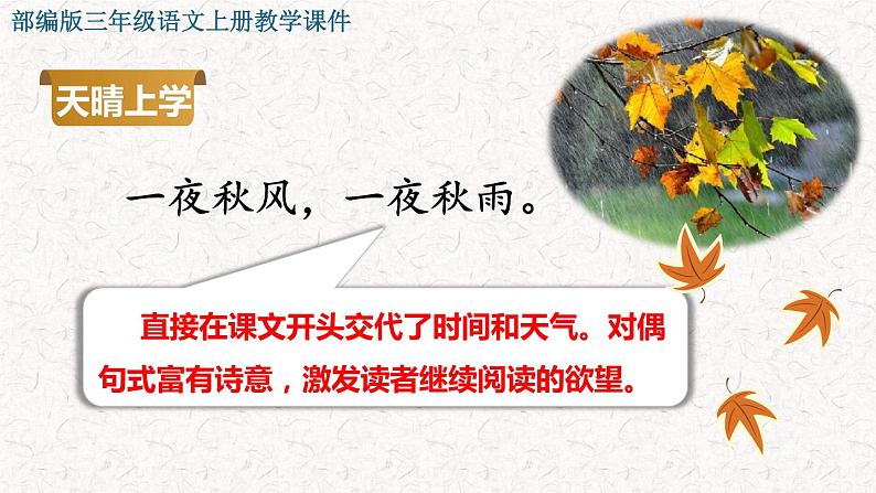 直接在课文开头交代了时间和天气。对偶句式富有诗意,激发读者继续阅读的欲望。