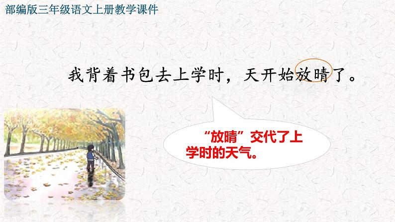 概念:汉语里,有些词可以用相近的词来代替,这样可以帮助我们理解词语。如果遇到一个词语,但不能准确说出它的意思,可以给这个词语找个相近的词,然后把找到的相近的词放到具体的句子中读一读,就能大体知道这个词语的意思了。运用:如课文第 3 自然段“多么明朗的天空”中的“明朗”,它的近义词是“晴朗”,把“晴朗”放入句子中读一读,就能知道“明朗”是说雨后的天空干净、光线充足。