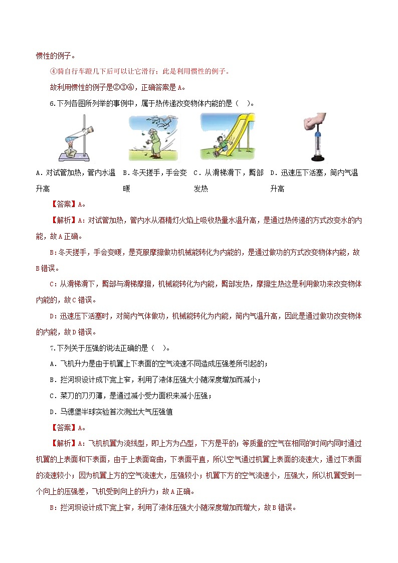【解析】A:飞机机翼为流线型,即上方为凸型,下方是平的;等质量的空气在相同的时间内同时通过机翼的上表面和下表面,由于上表面弯曲,下表面平直,所以空气通过机翼上表面的流速大,通过下表面的流速较小;因为机翼上方的空气流速大,压强较小;机翼下方的空气流速小,压强大,所以机翼受到一个向上的压强差,飞机受到向上的升力;故A正确。