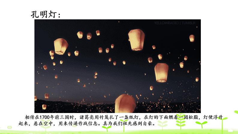 相传在1700年前三国时,诸葛亮用竹篾扎了一盏纸灯,在灯的下面燃着一团松脂,灯便浮升起来,悬在空中,用来传递作战信息。真为我们祖先感到自豪。