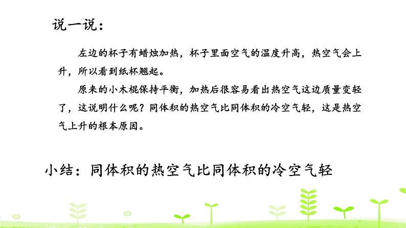 左边的杯子有蜡烛加热,杯子里面空气的温度升高,热空气会上升,所以看到纸杯翘起。 原来的小木棍保持平衡,加热后很容易看出热空气这边质量变轻了,这说明什么呢?同体积的热空气比同体积的冷空气轻,这是热空气上升的根本原因。