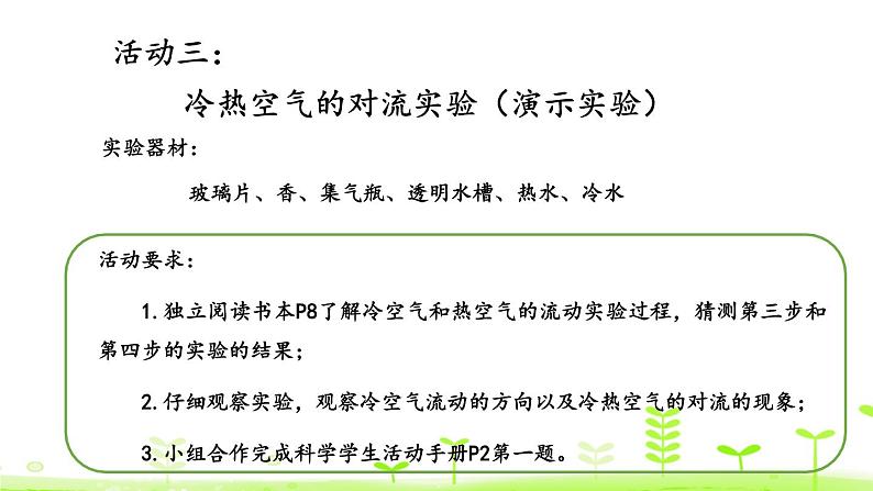 实验器材: 玻璃片、香、集气瓶、透明水槽、热水、冷水