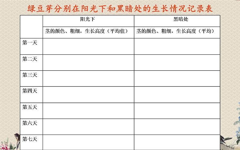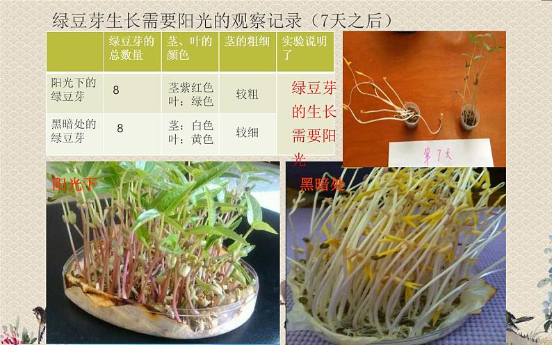 绿豆芽分别在阳光下和黑暗处的生长情况记录表