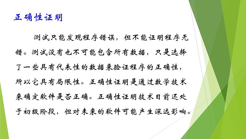 测试只能发现程序错误,但不能证明程序无错。测试没有也不可能包含所有数据,只是选择了一些具有代表性的数据来验证程序的正确性,所以它具有局限性。正确性证明是通过数学技术来确定软件是否正确。正确性证明技术目前还处于初级阶段,但对未来的软件可能产生深远影响。