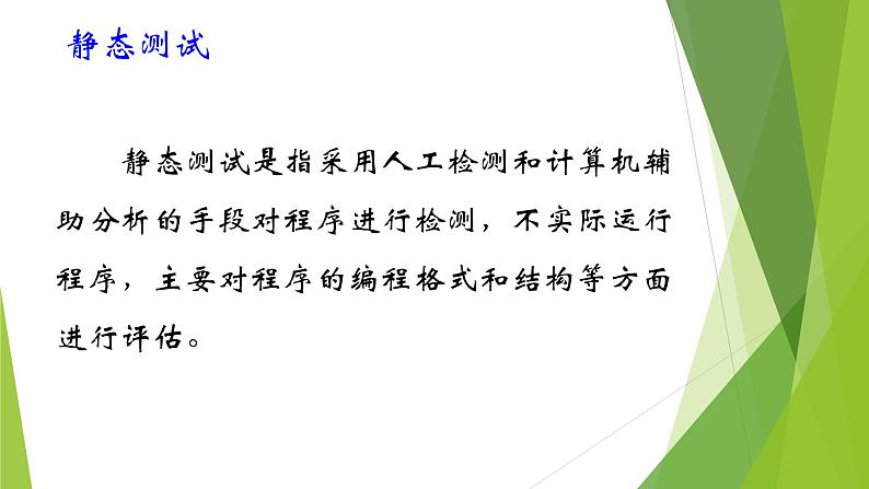 静态测试是指采用人工检测和计算机辅助分析的手段对程序进行检测,不实际运行程序,主要对程序的编程格式和结构等方面进行评估。