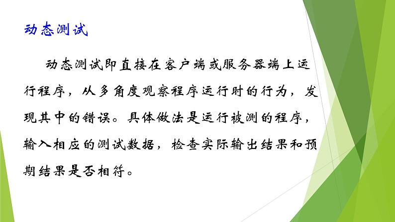 动态测试即直接在客户端或服务器端上运行程序,从多角度观察程序运行时的行为,发现其中的错误。具体做法是运行被测的程序,输入相应的测试数据,检查实际输出结果和预期结果是否相符。