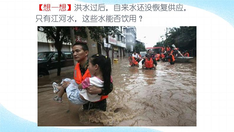 【想一想】洪水过后,自来水还没恢复供应,只有江河水,这些水能否饮用?