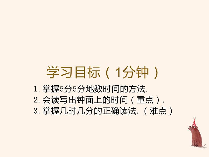 1.掌握5分5分地数时间的方法.2.会读写出钟面上的时间(重点).3.掌握几时几分的正确读法.(难点)