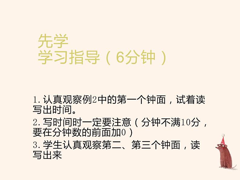 1.认真观察例2中的第一个钟面,试着读写出时间。2.写时间时一定要注意(分钟不满10分,要在分钟数的前面加0)3.学生认真观察第二、第三个钟面,读写出来