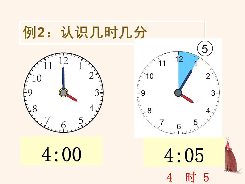 1.观察每一个钟面上时针和分针所在的位置,分针走一小格是1分,走一大格是5分,时针走过了几是几小时。