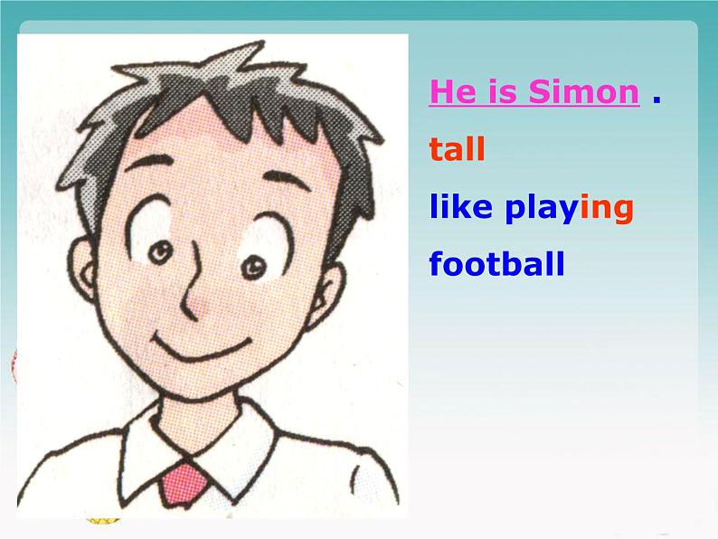 Simn is very tall. He lves playing _________. Sandy is tall and ____. She has ____________ . She likes listening t ______. Daniel is frm _______. He is gd at ______.