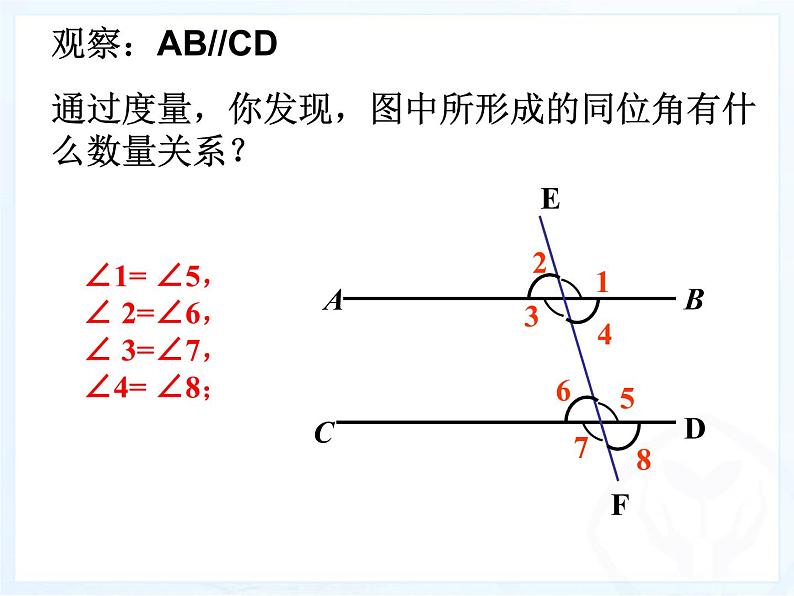 观察:AB//CD通过度量,你发现,图中所形成的同位角有什么数量关系?