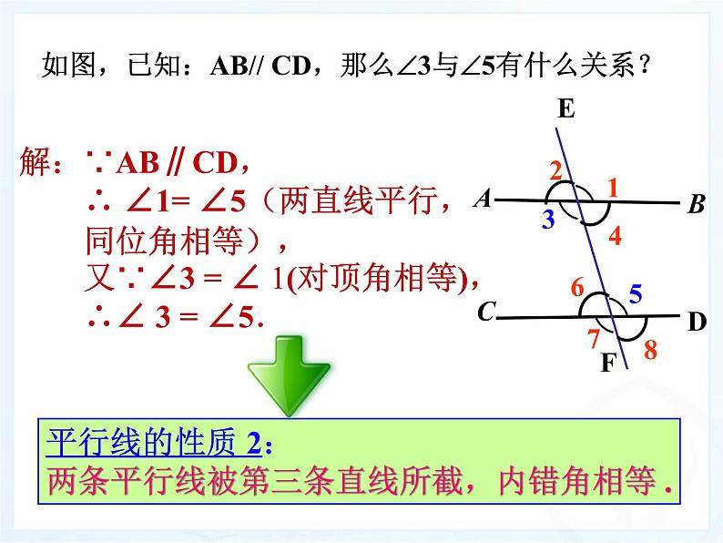 解:∵AB∥CD, ∴ ∠1= ∠5(两直线平行, 同位角相等), 又∵∠3 = ∠ 1(对顶角相等), ∴∠ 3 = ∠5.