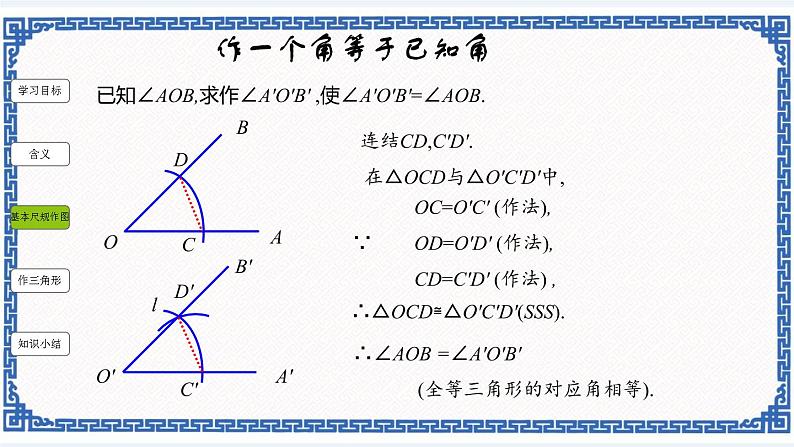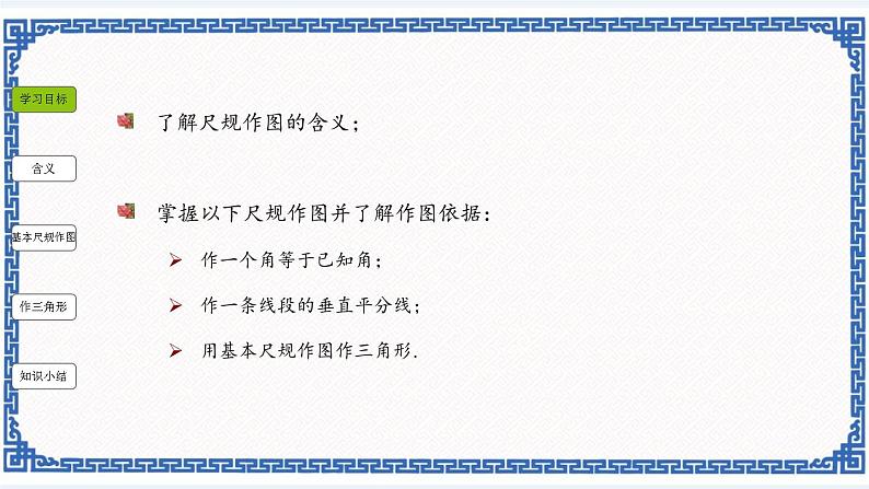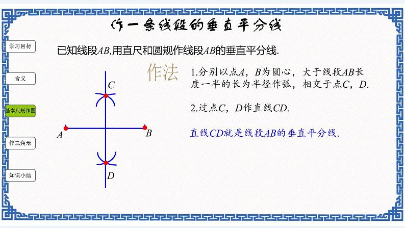 初中数学1.6 尺规作图示范课课件ppt: 这是一份初中数学1.6 尺规作图示范课课件ppt,共24页。PPT课件主要包含了教学目标,画线段,画角平分线,连接CDCD,SSS,OCOC,ODOD,CDCD,画垂直平分线,垂直平分线的定义等内容,欢迎下载使用。