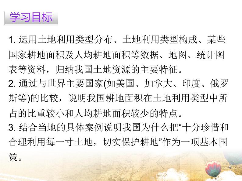1. 运用土地利用类型分布、土地利用类型构成、某些国家耕地面积及人均耕地面积等数据、地图、统计图表等资料,归纳我国土地资源的主要特征。2. 通过与世界主要国家(如美国、加拿大、印度、俄罗斯等)的比较,说明我国耕地面积在土地利用类型中所占的比重较小和人均耕地面积较少的特点。3. 结合当地的具体案例说明我国为什么把“十分珍惜和合理利用每一寸土地,切实保护耕地”作为一项基本国策。