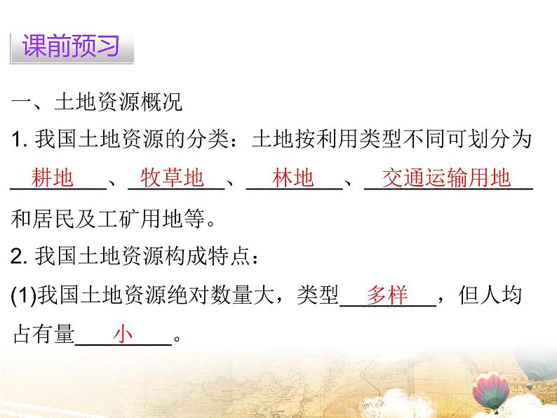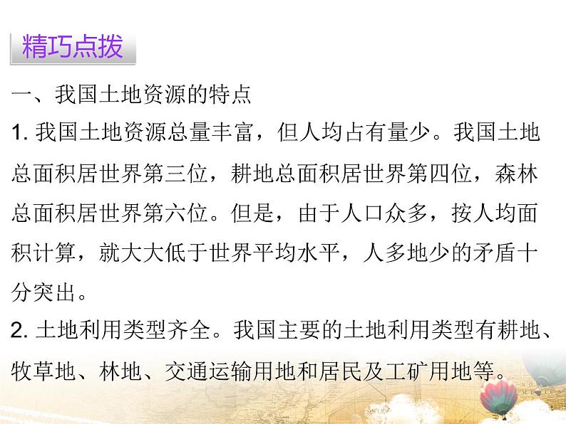 一、我国土地资源的特点 1. 我国土地资源总量丰富,但人均占有量少。我国土地总面积居世界第三位,耕地总面积居世界第四位,森林总面积居世界第六位。但是,由于人口众多,按人均面积计算,就大大低于世界平均水平,人多地少的矛盾十分突出。 2. 土地利用类型齐全。我国主要的土地利用类型有耕地、牧草地、林地、交通运输用地和居民及工矿用地等。