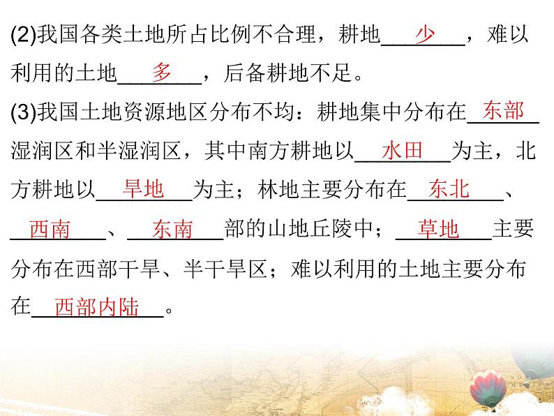 (2)我国各类土地所占比例不合理,耕地_______,难以利用的土地_______,后备耕地不足。(3)我国土地资源地区分布不均:耕地集中分布在______湿润区和半湿润区,其中南方耕地以________为主,北方耕地以________为主;林地主要分布在________、________、________部的山地丘陵中;________主要分布在西部干旱、半干旱区;难以利用的土地主要分布在___________。